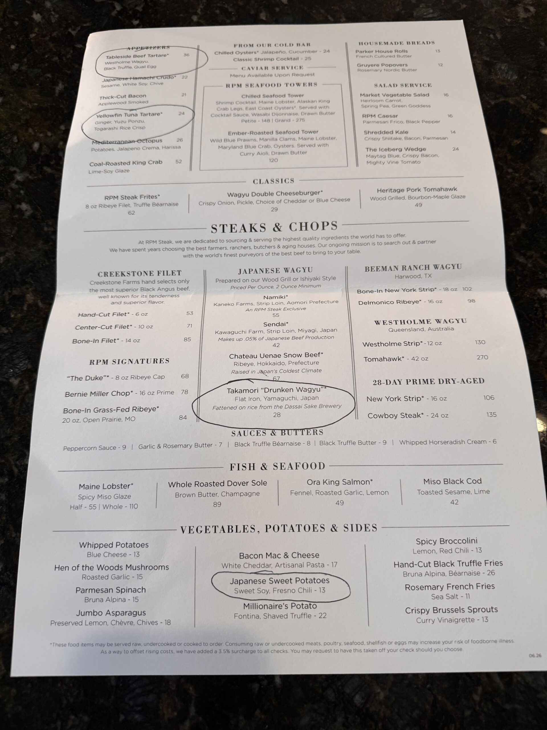 Menu from RPM Steakhouse with the four items we sampled circled.