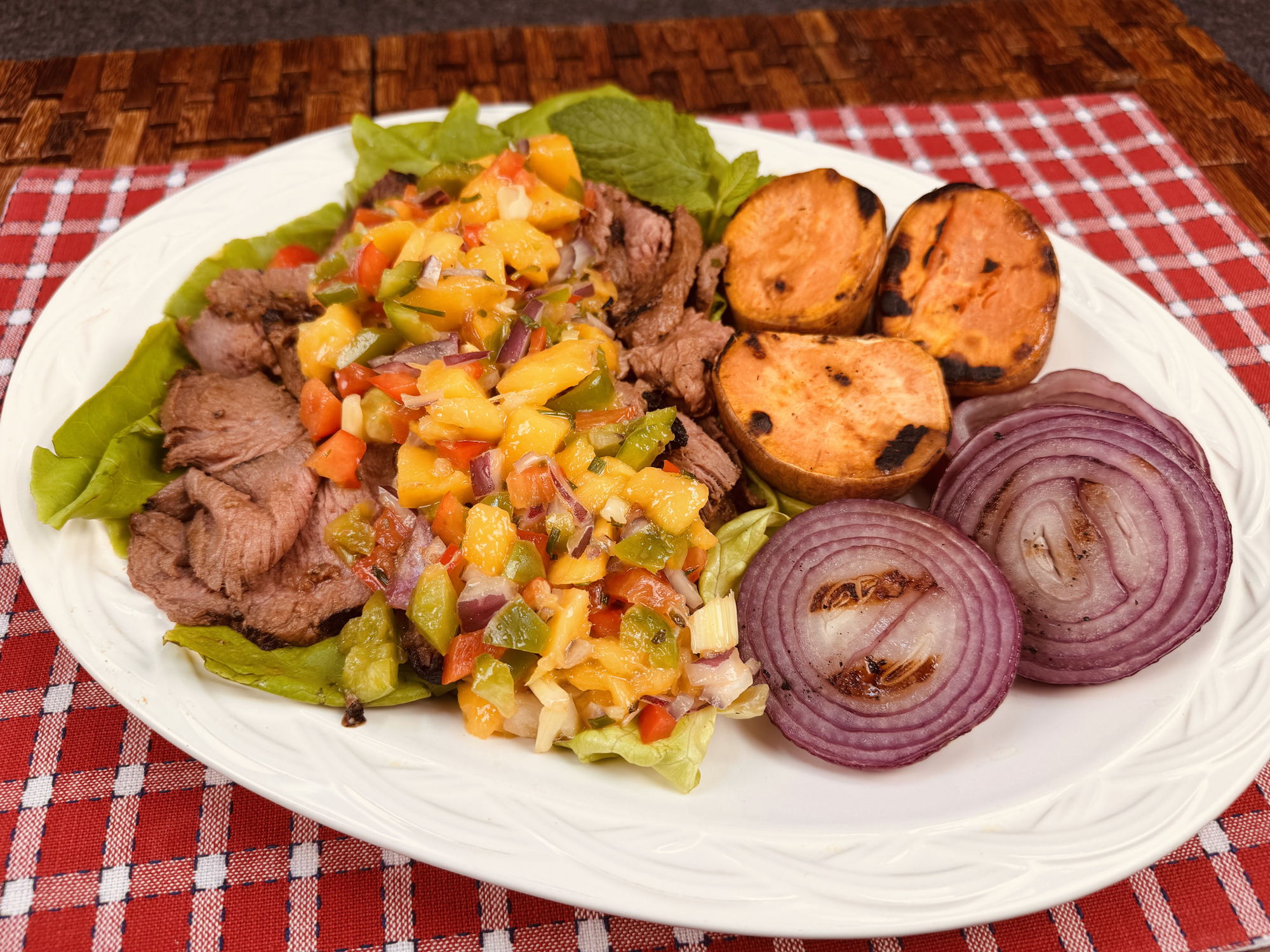 About the Recipe: Sizzle into summer with this award-winning marinated steak, now with a 2025 twist: a zesty chili-lime marinade and a touch of smoked paprika. Thinly sliced and served atop crisp lettuce, this dish bursts with chilled mango salsa, caramelized grilled sweet onions, and roasted yams. Perfect for barbecues, the steak and salsa can be prepped a day ahead for effortless entertaining. Fire up the grill and wow your guests with this vibrant, flavor-packed feast!