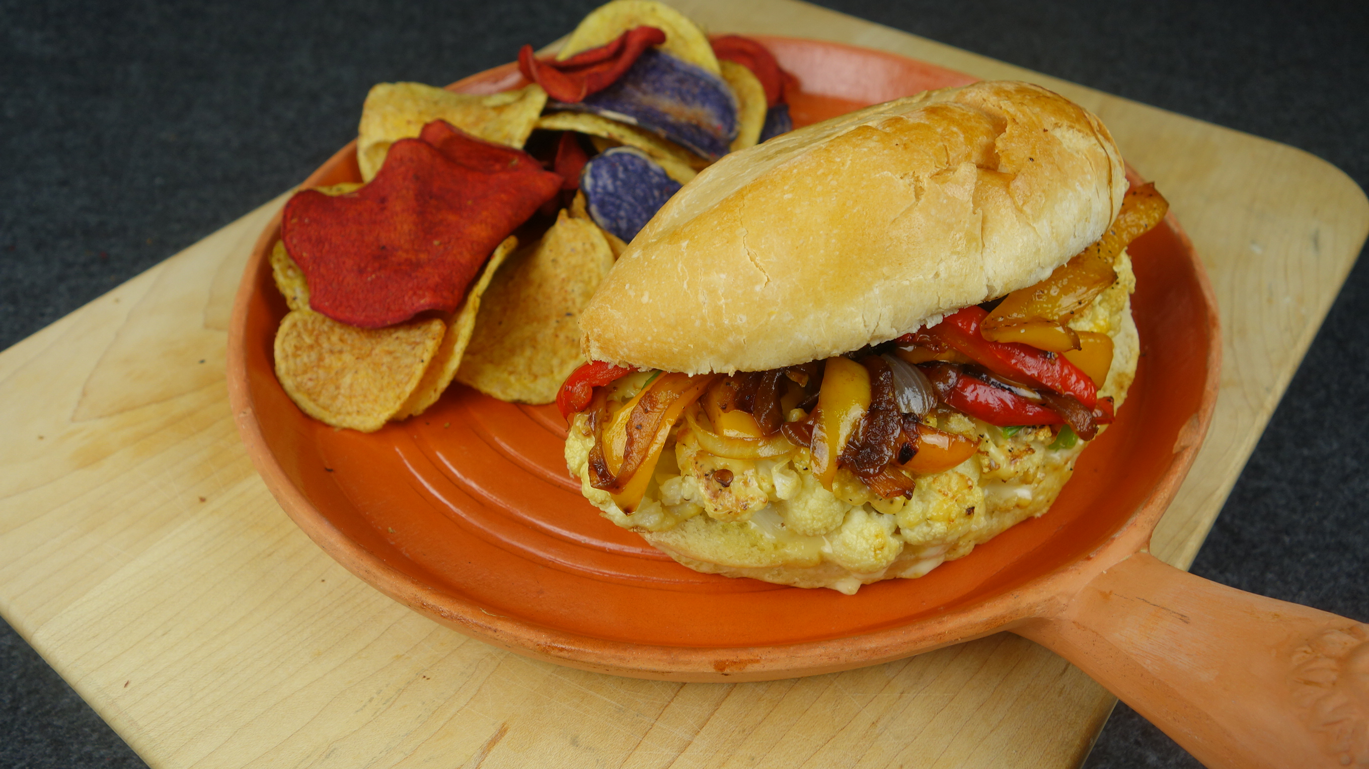 About the Recipe: Roasted cauliflower is delicious, but when you combine it with lightly peppered melting cheese, heap it into a crunchy toasted bun, and then top it with glistening caramelized onions and peppers, you create an unbelievably delicious veggie sandwich. Who said you couldn’t have a cheesesteak sandwich?