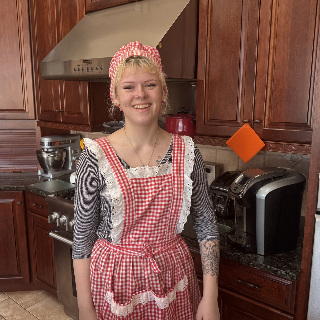 Traveling north to Wisconsin today amidst the snow that is starting to fall, I kept thinking how much I loved this weather. I think I’ll make a stop at Ivy’s house and see what this teenager has on her schedule. It’s early so I’ll just quietly hang out in her kitchen behind this cute little basket. Wait! What is this? I’m smelling fresh-baked cookies, don’t tell me that she made this basket out of chocolate cookies. That girl is amazing! Shh, someone’s coming; better duck behind the basket.