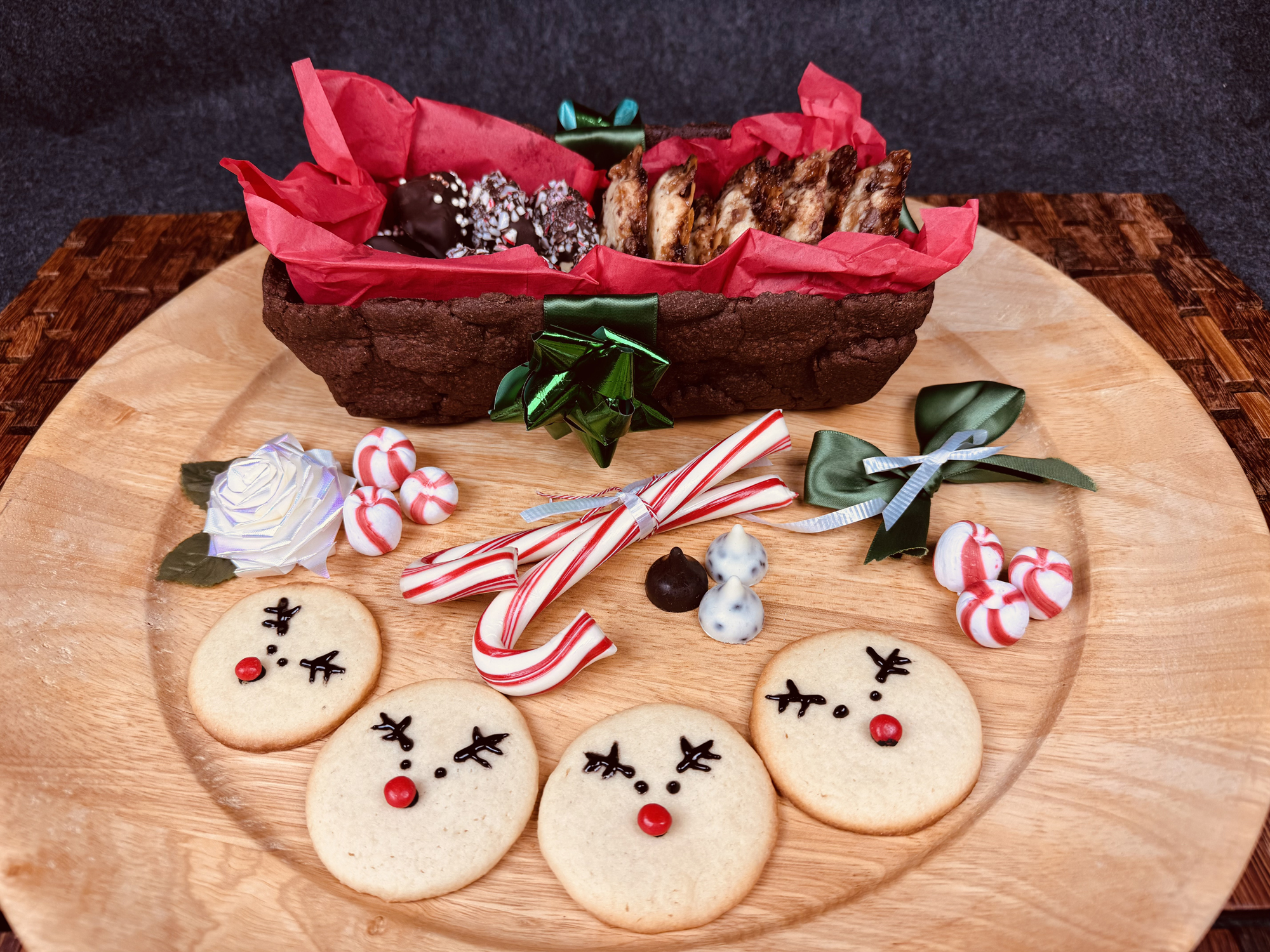 Ivy heads for the refrigerator and removes a large dish with 3 pieces of dough. Staying as quiet as an elf can be, I watch her work her magic: shaping the first into round reindeer cookies with icing antlers and candy noses, slicing the second into chocolate-dipped peppermint delights, and rolling the third in toffee bits for a crunchy surprise. Three different cookies using creamy Wisconsin cheese from one batch of dough. Wow! Mrs. Claus would love that! Then like a culinary chef, Ivy arranges them in the cookie basket. I couldn’t help but giggle thinking that Santa could eat the cookies and the basket. Hope Ivy puts the recipe on the web. Santa’s in for a new experience when he stops here!