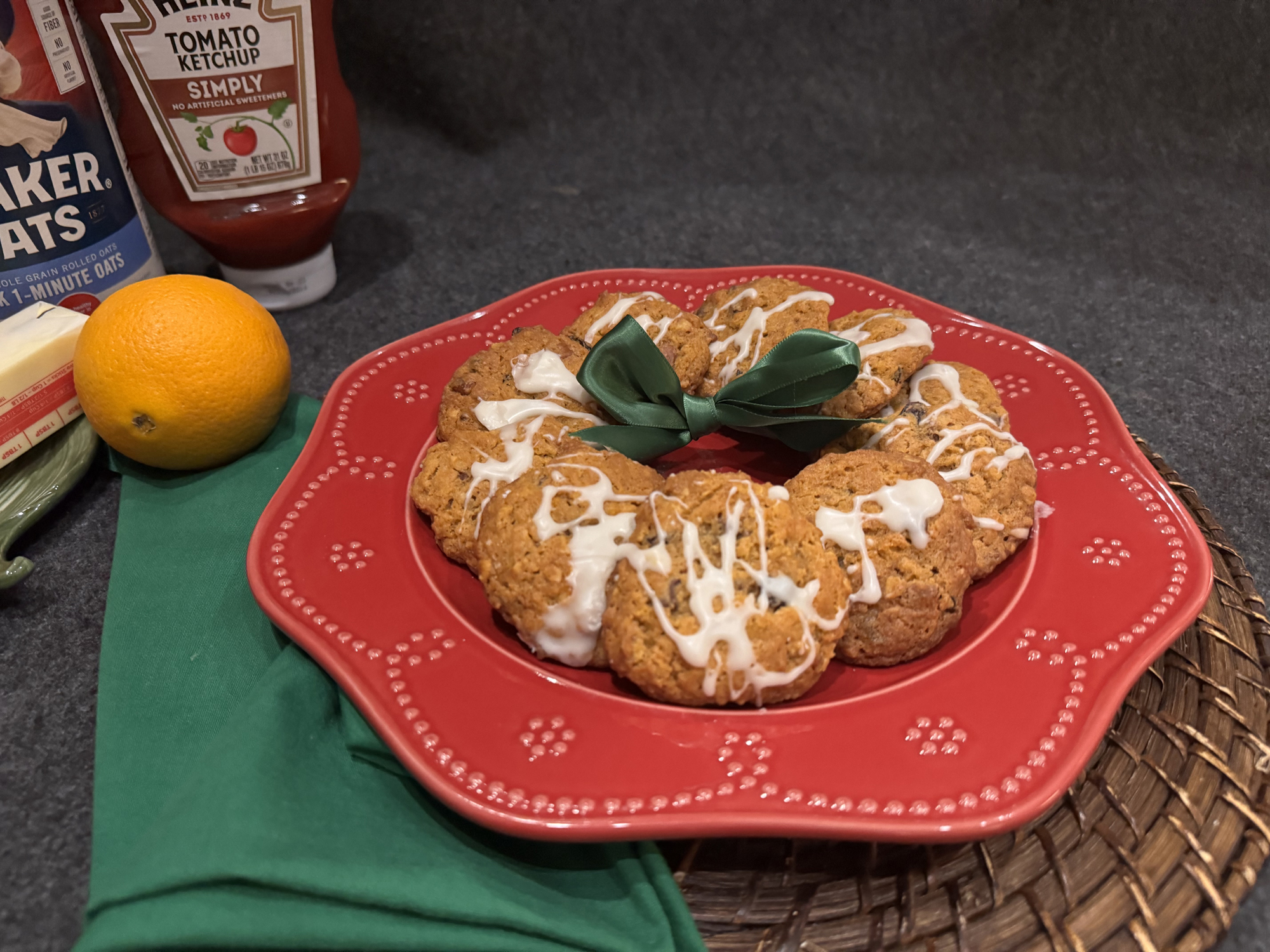 About the Recipe: These crispy, buttery oatmeal cookies are packed with texture and unexpected holiday cheer: crunchy pecans, sweet raisin pieces, and pops of mini chocolate chips. The real secret? A touch of ketchup! It lends a subtle tangy-spicy depth and a beautiful rosy glow that no one will ever guess. Great for cookie swaps, care packages, or just keeping your own little delicious secret. Bake a batch and watch everyone try to figure out what makes them so wildly delicious!