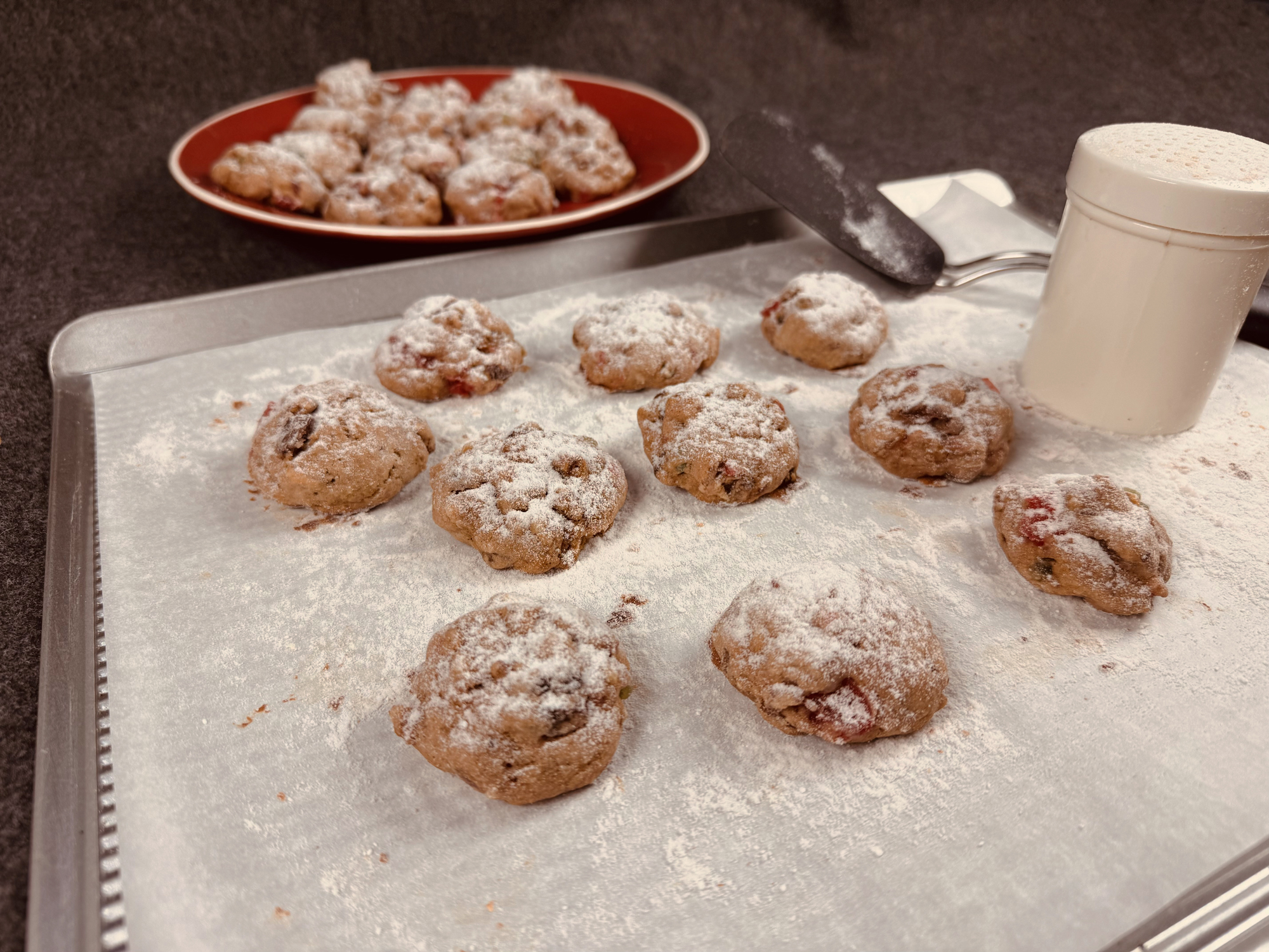 About the Recipe: This classic of a recipe first appeared in a 1975 issue of Family Circle magazine and quickly became a holiday favorite. Plump raisins, bright red-and-green candied cherries, and a whisper of orange citron are soaked in a splash of rum, then folded into a lightly spiced dough, fragrant with cinnamon, cloves, and nutmeg. After an overnight chill, the dough is shaped into walnut-sized balls, baked until barely golden, and given a snowy dusting of powdered sugar. The result? A soft, chewy cookie that captures all the nostalgic flavors of traditional fruitcake, yet even fruitcake skeptics find themselves reaching for “just one more.”