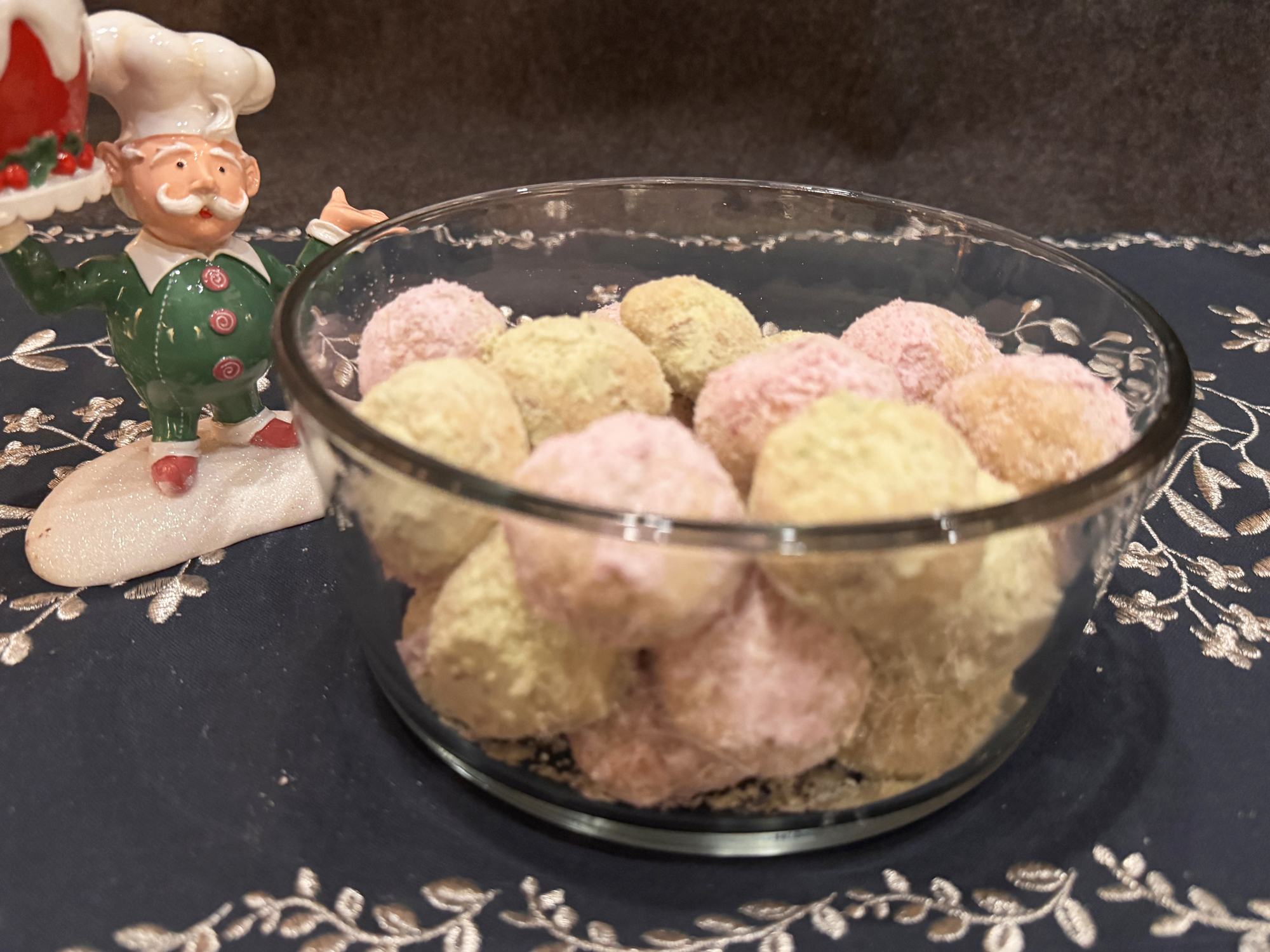 About the Recipe: These snowball cookies create a magical blend of colors from light mint green and blushing pink to creamy white, capturing people’s hearts with their delicious taste, unique appearance, and memories of those snowball fights and making angels in the freshly fallen snow. These round, powdered sugar-coated snowball cookies bring forth that sense of remembering, especially during the holiday season. They are a standout on dessert platters, leaving that cozy feeling of gathering with family and friends. Have some fun and add a touch of whimsy to your festive table this year.
