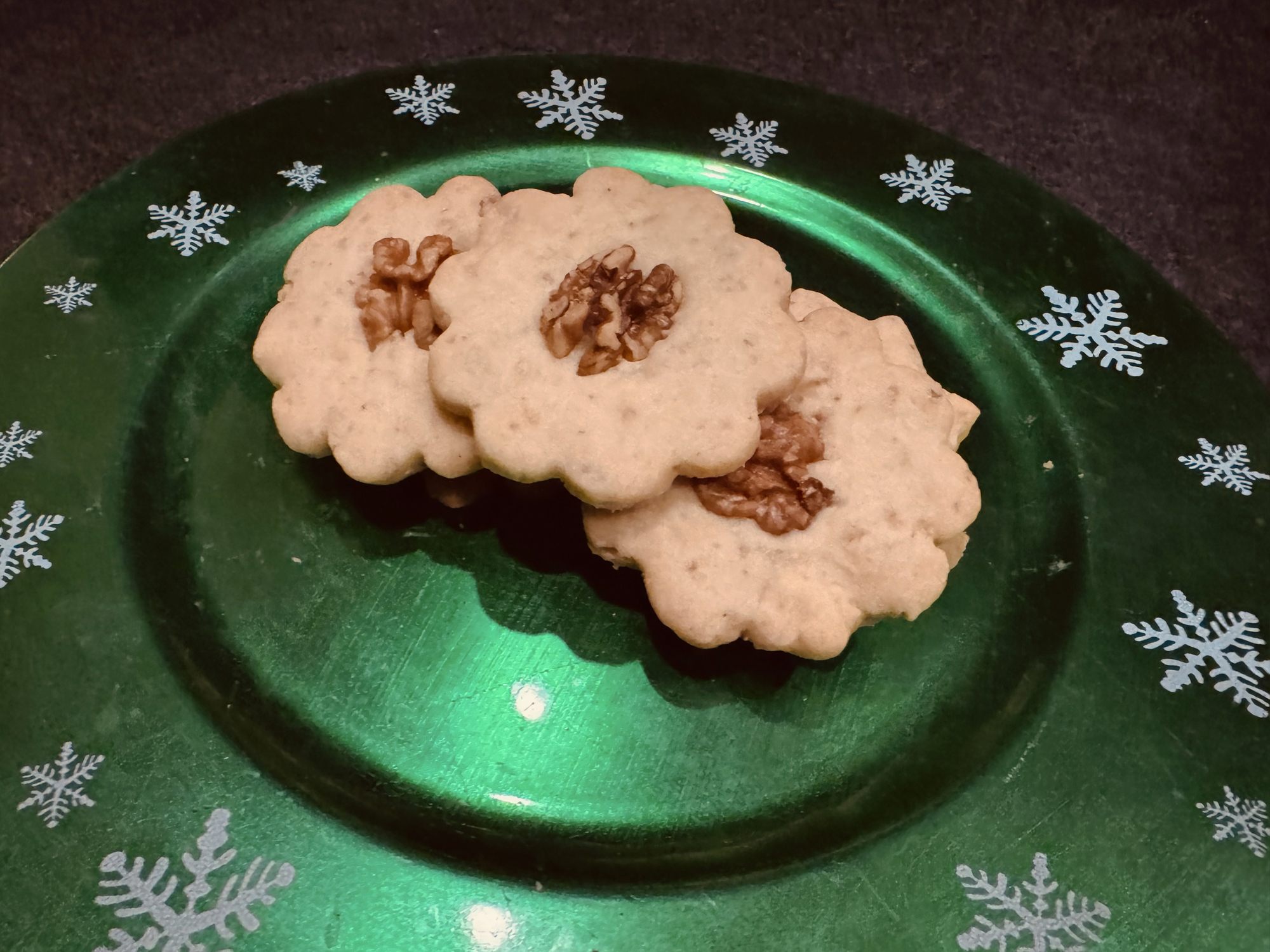As I squeezed between the mountains of old cookbooks piled on his table, I spotted him; smiling and laughing while he mixed just a few simple ingredients. He rolled out the dough with a flourish, topped each cookie with a perfect walnut half, and slid them into the oven to bake until golden brown. The kitchen filled with the warm, buttery aroma that made my elf nose twitch with delight.