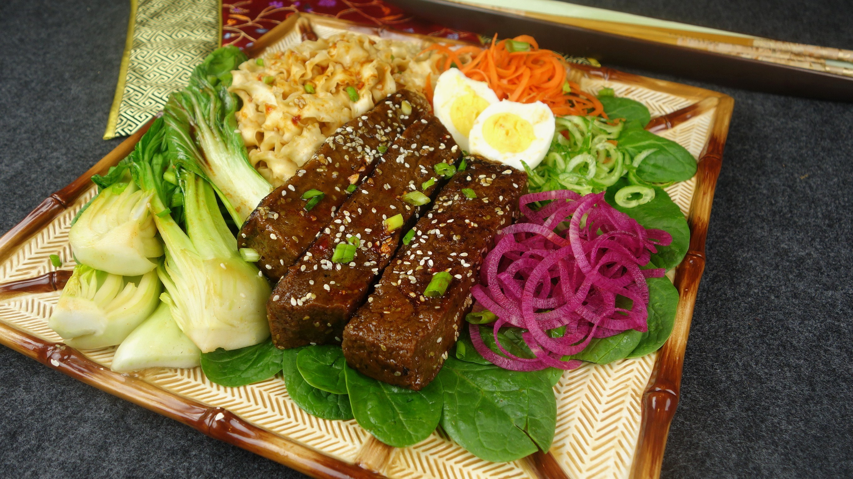 About the Recipe: This vibrant vegetarian Korean-style dish brings together a variety of Asian favorites. The plate features lively, flavorful noodles, tender Bok choy, and ribbons of crisp carrots, cucumbers, and radishes. Garnished with soft-boiled eggs, it’s both visually appealing and satisfying. The vegan Korean ribs, made to mimic the texture and taste of classic short ribs, are generously seasoned with garlic, ginger, hoisin, and both light and dark soy sauces. Each bite is a blend of sweet, tangy, and nutty notes, resulting in a light yet deeply flavorful meal.