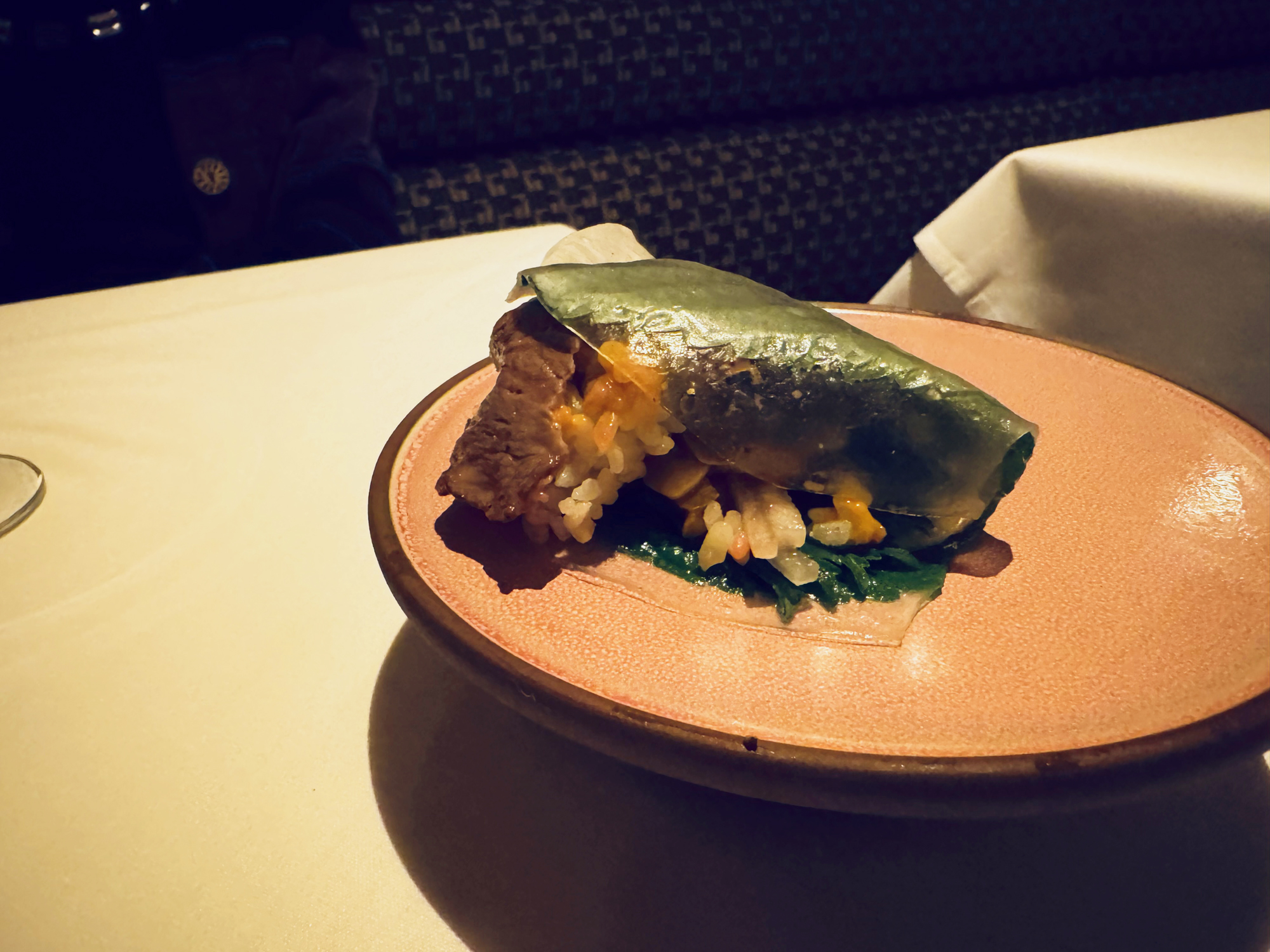 About the Recipe: Wagyu Ssam with Ssamjang & Herbs was a Korean-inspired dish, that featured a tender slice of Wagyu beef wrapped in a fresh leafy green and paired with a savory, slightly spiced Korean sauce. Fresh herbs added brightness and complexity, creating a harmonious bite and fantastic starter course.