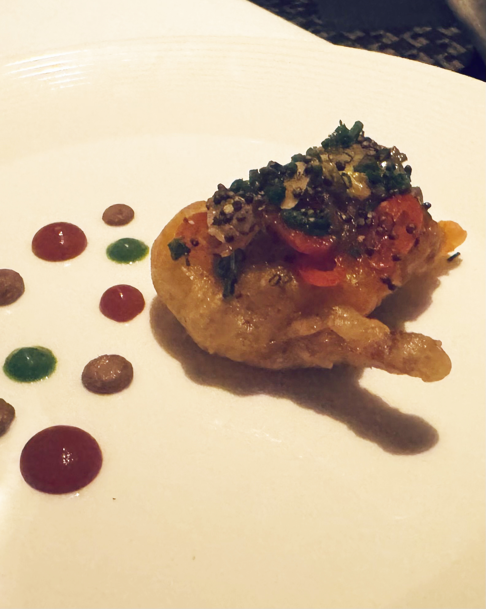 About the Recipe: Korean Fried Quail with Black Garlic and Walnut Purée & Strawberry Gochujang was an updated interpretation of Korean fried chicken. The dish featured a tiny, tender quail leg, lightly battered until perfectly crisp. Across the plate were multicolored saucy dots of spicy strawberry gochujang, walnut blended golden garlic, and vibrant green scallions. The dish was fun to eat and created colorful splashes of color across the plate as one dipped and nibbled. Three cheers to Chef Andrew Lim for creating such a playful, artistic Korean dish.