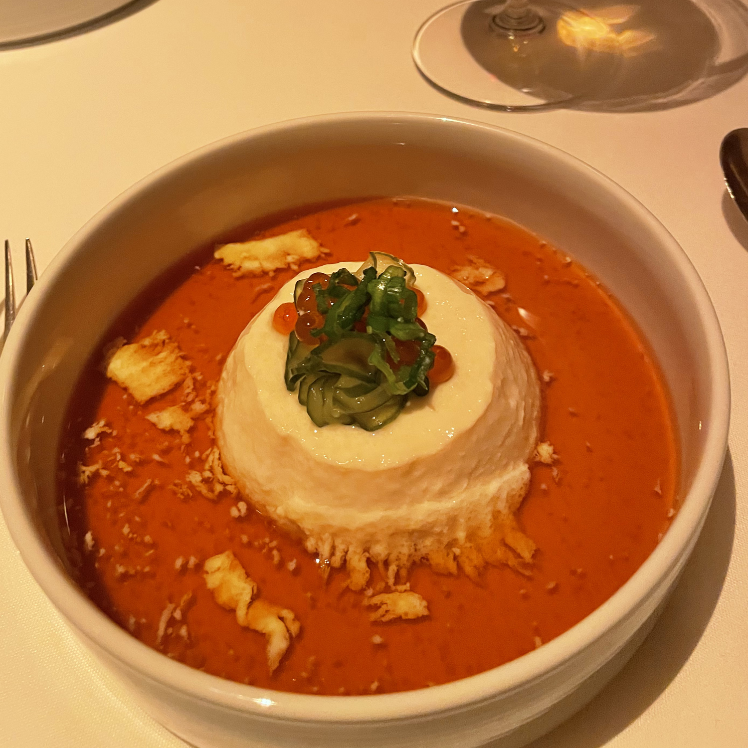 About the Recipe: Hiyashi Tofu with Ponzu, Ikura & Pickled Cucumbers was an elegant starter that highlighted clean flavors and delicate textures. A generous layered round of chilled silken tofu was served with a refreshing ponzu sauce, offering a balance of citrus and umami. On top were thinly sliced pickled mini cucumbers, sprinkled with bright orange pearls of salmon roe. The attractive pop of color and burst of briny flavor offered a crisp, tangy contrast and freshness.