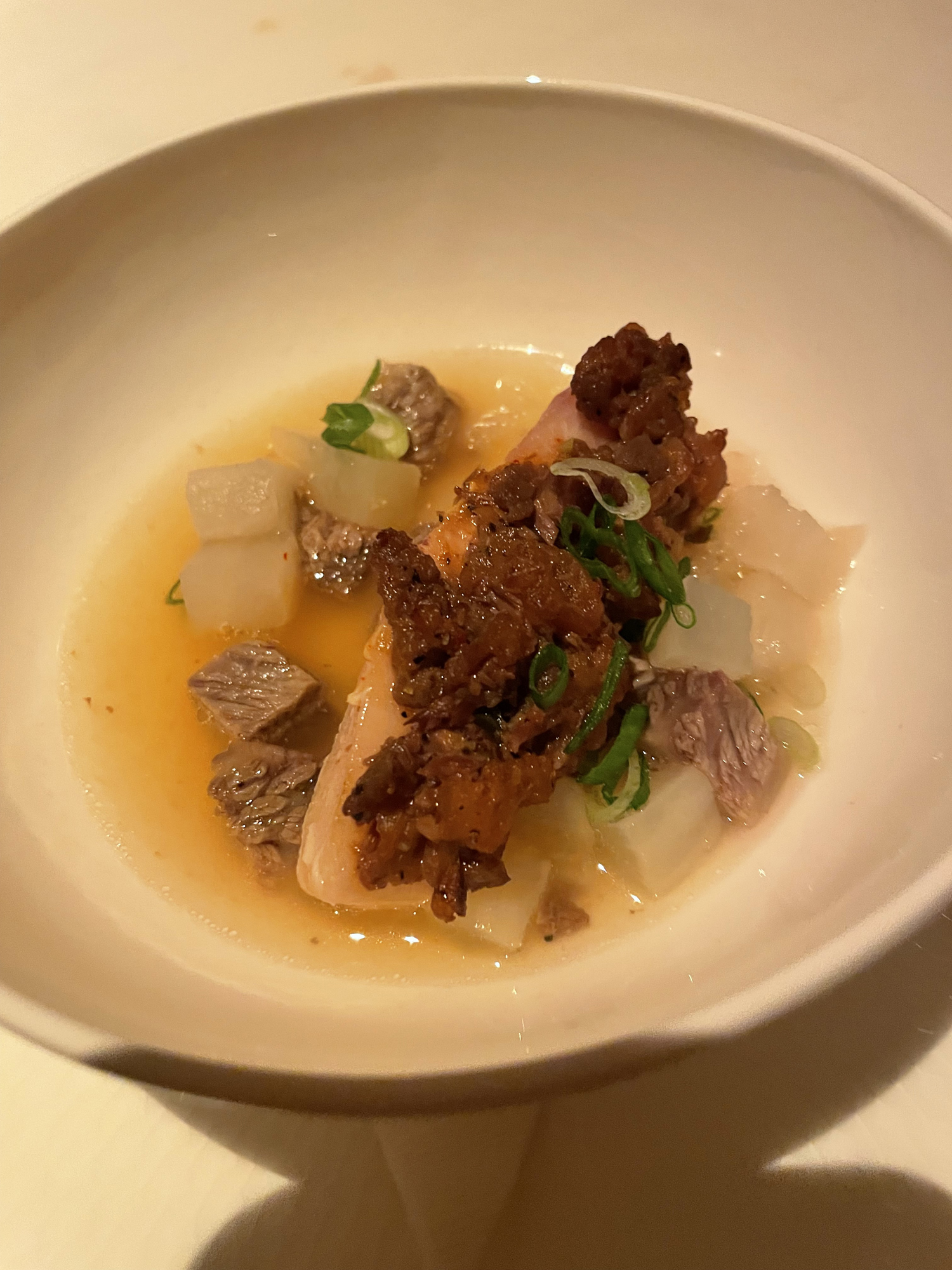 About the Recipe: Olive Oil Poached Bang-eo with Korean Barbecue Beef Crust & Savory Oxtail Broth featured silky yellowtail (bang-eo) fish) gently poached in olive oil to preserve its delicate flavor and buttery texture and topped with a savory Korean barbecue beef crust. A rich aromatic oxtail broth was poured over the smoky, caramelized layer, combining the meaty undertones with the mildness of the yellowfish. The dish takes bold spicy barbecue to a new, tasting experience.