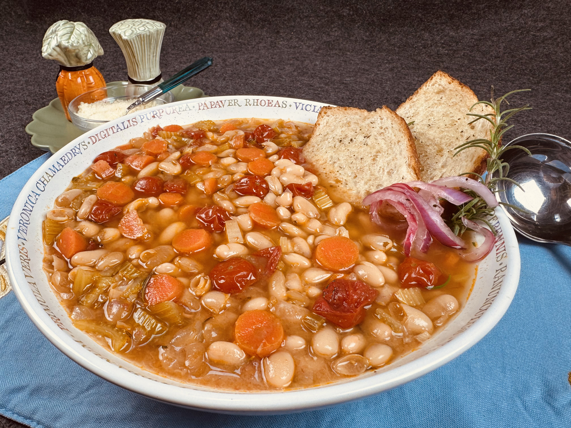About the Recipe: A hearty supper dish for one of those cold cloudy evenings. It is so flavorful, easy to make, and uses simple ingredients. It’s almost ready when you are. This Italian soup is filled with cannellini beans, lots of fresh vegetables, and seasoned with garden-fresh herbs. It’s an easy quick supper entrée.