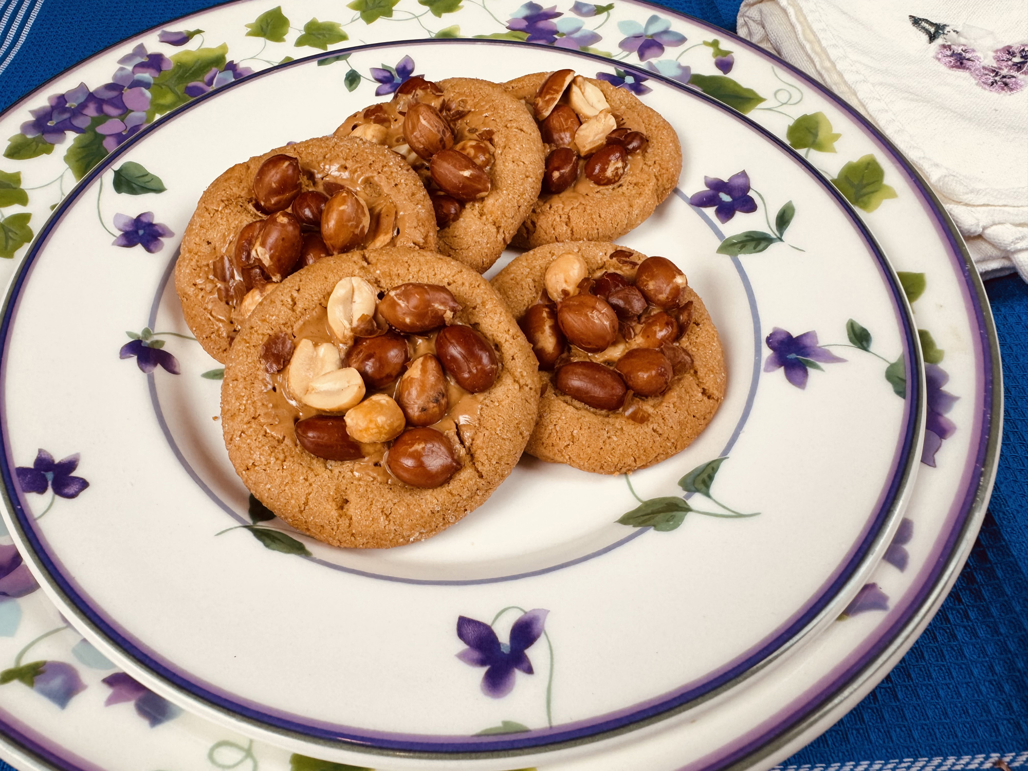 About the Recipe: According to the story, Nancy Silverton was inspired by her friend Roxana Jullapat to create this cookie. It has an intensely nutty dough and a topping of salty roasted peanuts with skins, but the prize is the soft peanut butter that is hidden in the center of the cookie. We used chickpea flour in place of sorghum flour and made about 2 dozen cookies. The original recipe makes about 4 dozen. This recipe makes one of the best peanut butter cookies we have ever tasted. Three cheers for you, Nancy.