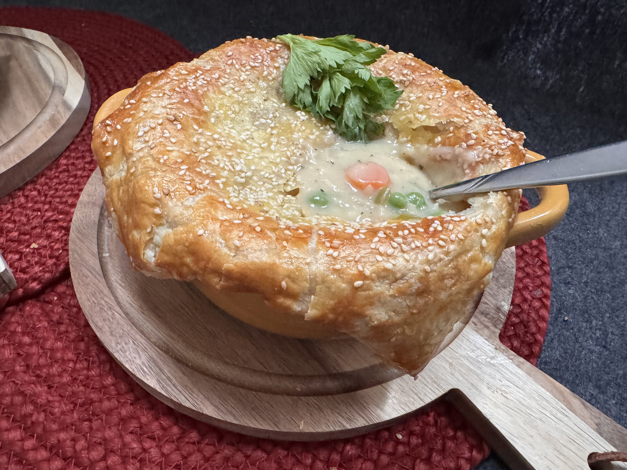 Cook’s Note: We doubled the recipe and used carrots, celery, peas, with-skins-on potatoes, celery, onions, and added a clove of garlic with some of our favorite herbs. We made two pies, using two round bowls with puff pastry crusts, which required two puff pastry sheets since it needed more than one sheet. The next day, we made another 9-inch pie with our leftover filling using a standard pie crust. We also added some cooked chicken pieces to the second pie we made. Nothing like Great Leftovers. Yum!