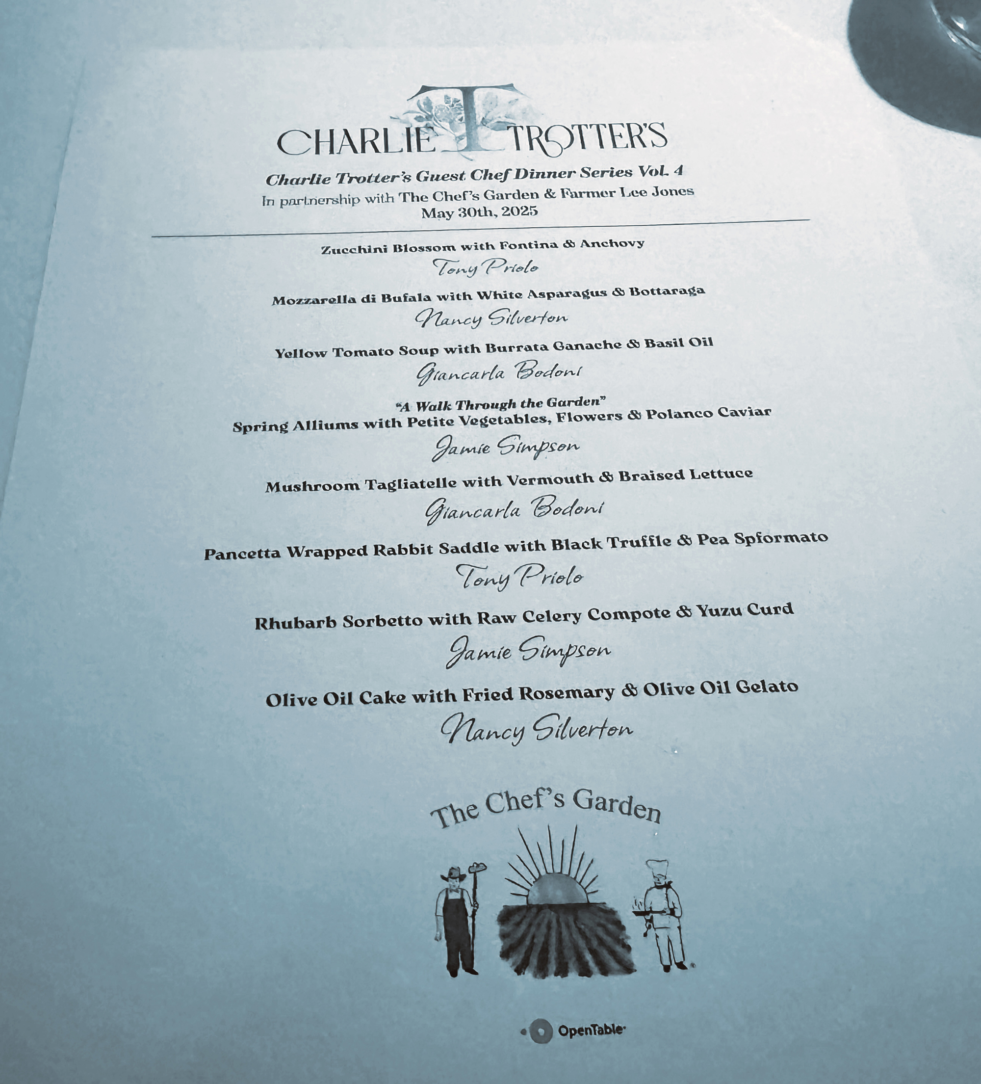The menu from May 30th dinner at Charlie Trotter’s Guest Chef Series Vol. 4 in partnership with The Chef’s Garden & Farmer Lee Jones.