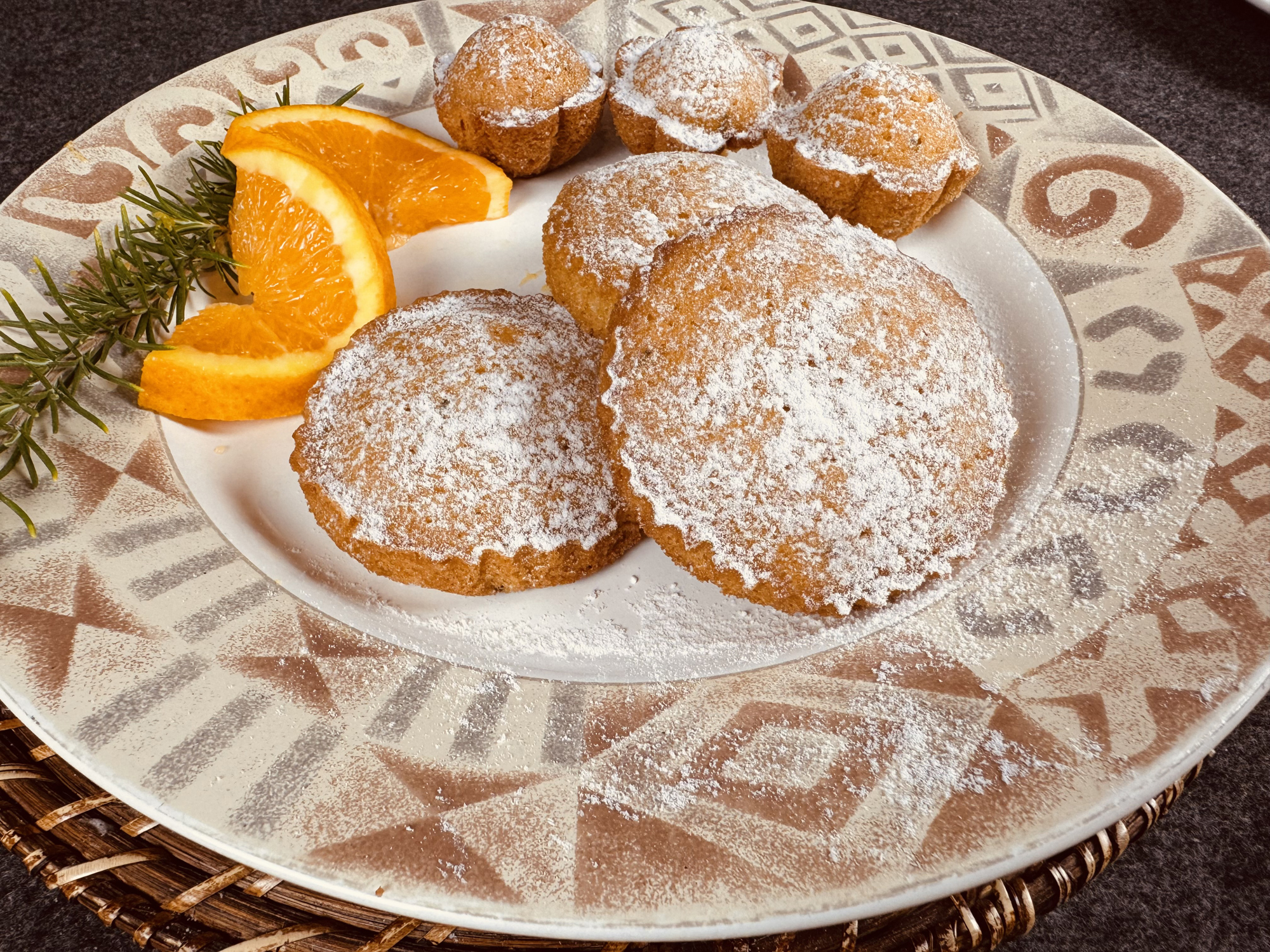 For the Recipe: The small cakes are “out of this world” delicious, moist, soft yet crunchy, lightly flavored with fresh oranges and rosemary. No heavy frostings are necessary, just a finishing touch of confectiones’ sugar. They are perfect for serving as a light snack and dinner dessert, topped with some melting ice cream.