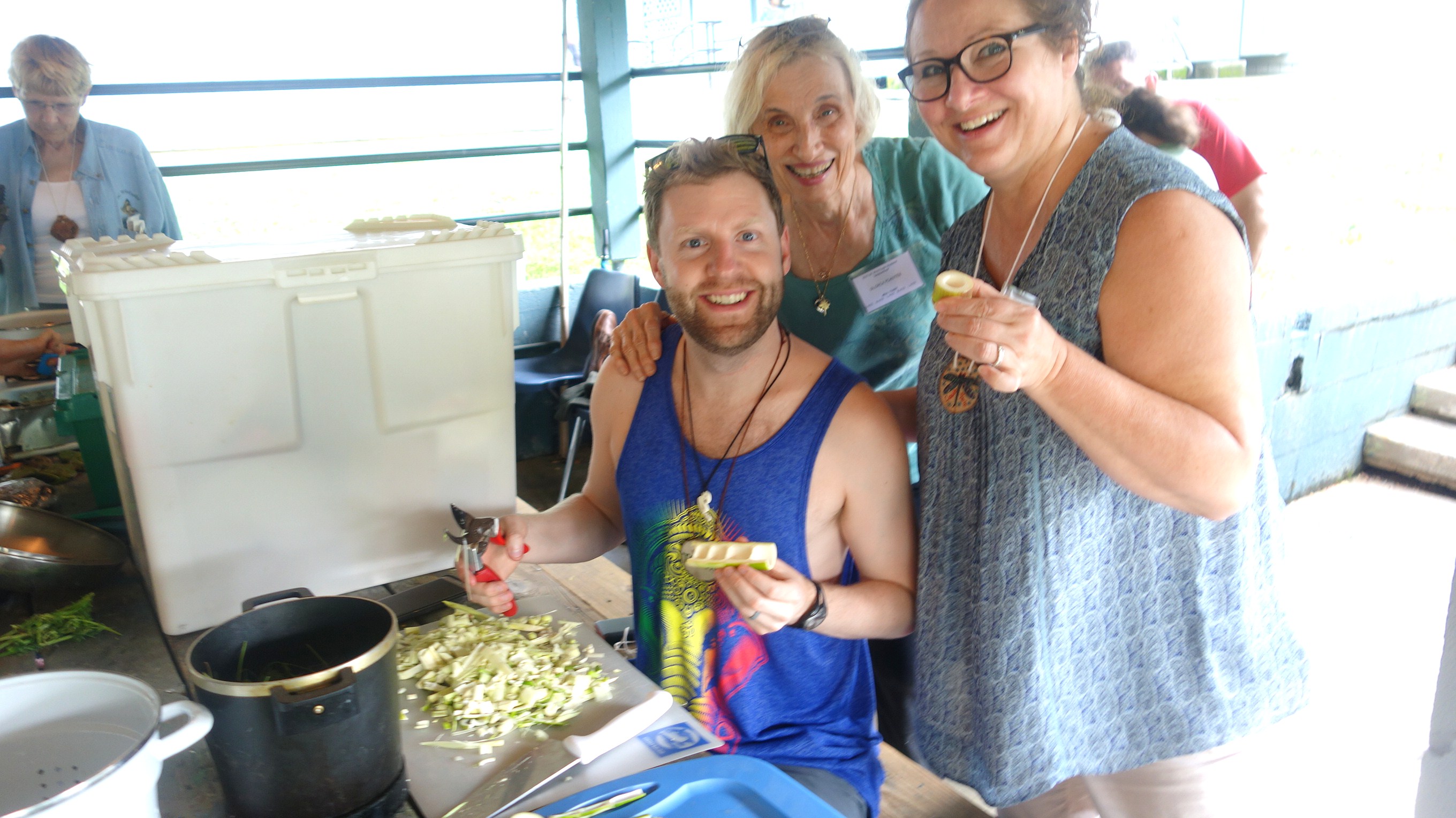 Taylor Mills, with Connie Hutchinson & Gloria Goodtaste looking on, Prepares Bamboo Shoots with Pesto for Wild Feast