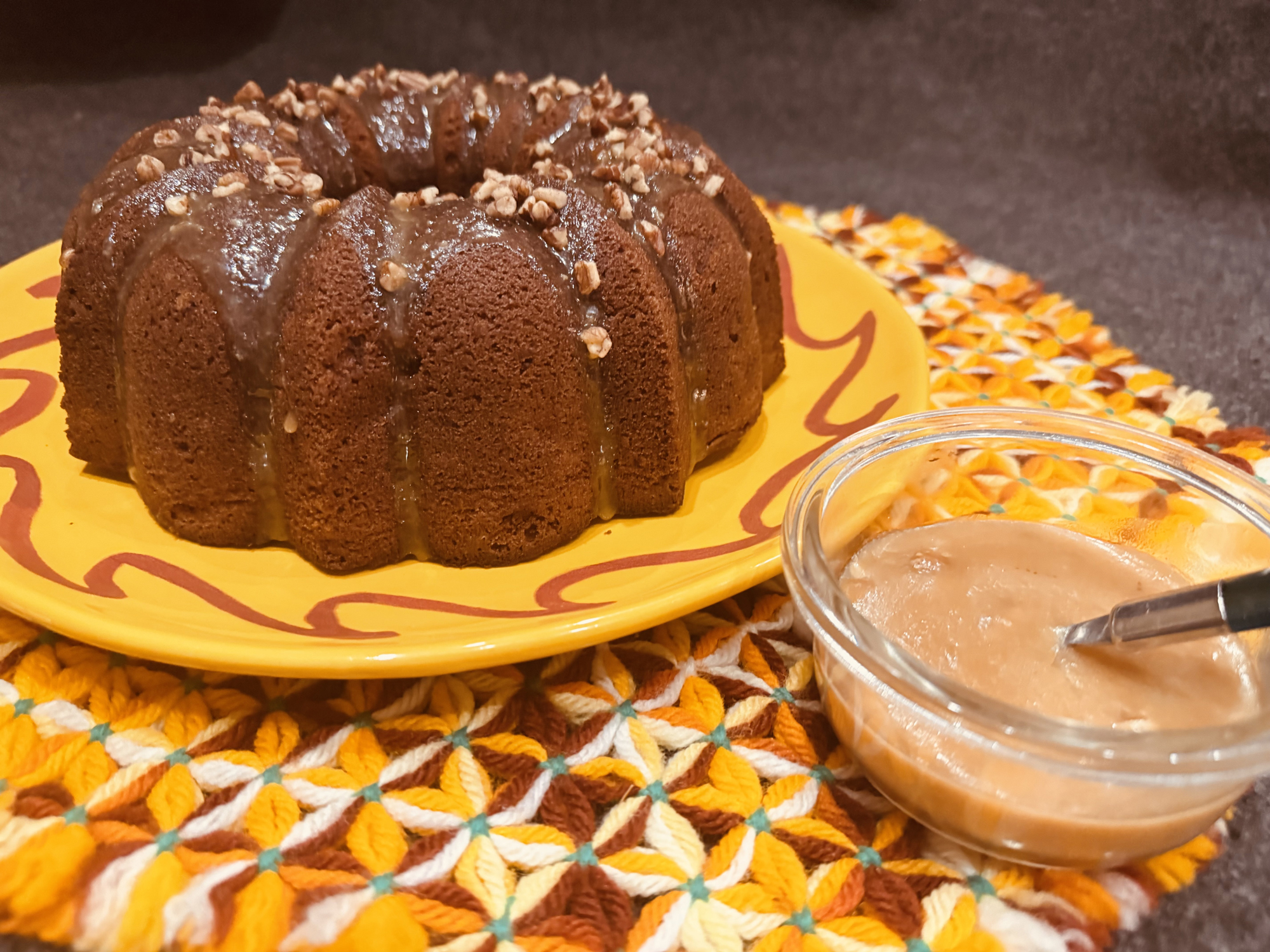 About the Recipe: This dessert combines tender apples, warm spices, and rich caramel in a moist, flavorful Bundt cake that is both comforting and elegant. It’s baked in a classic Bundt pan and is moist and filled with chunks of fresh apples. It has a delightful blend of flavors with light cinnamon and nutmeg creating an inviting aroma. The rich caramel sauce is poured over the cake, and I sprinkled the top with pecans, creating a decadent, sweet finish.