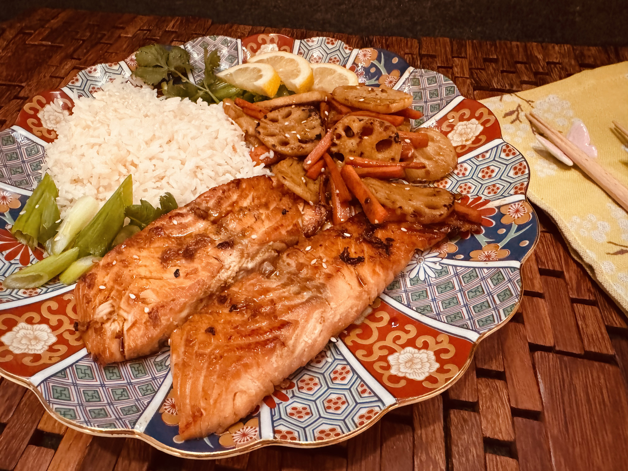 To Serve: Plate salmon, drizzle with reduced sauce, and garnish with green onion. Serve with a lemon wedge, cooked rice, and Lotus Root Stir-Fry on the side.