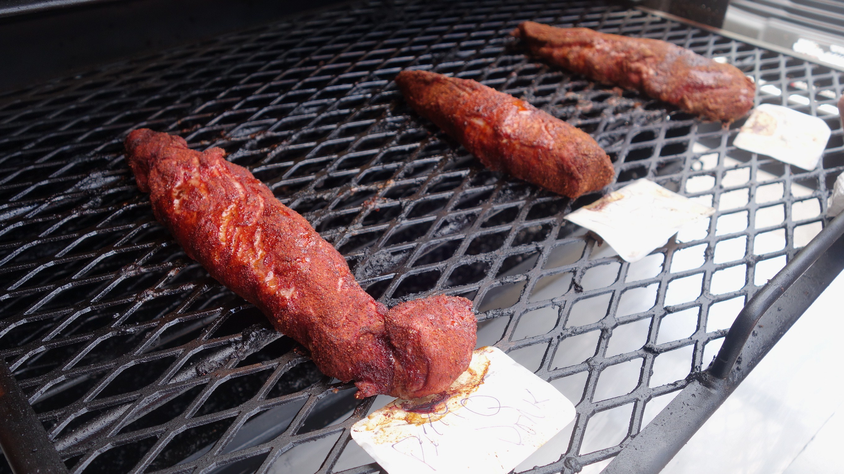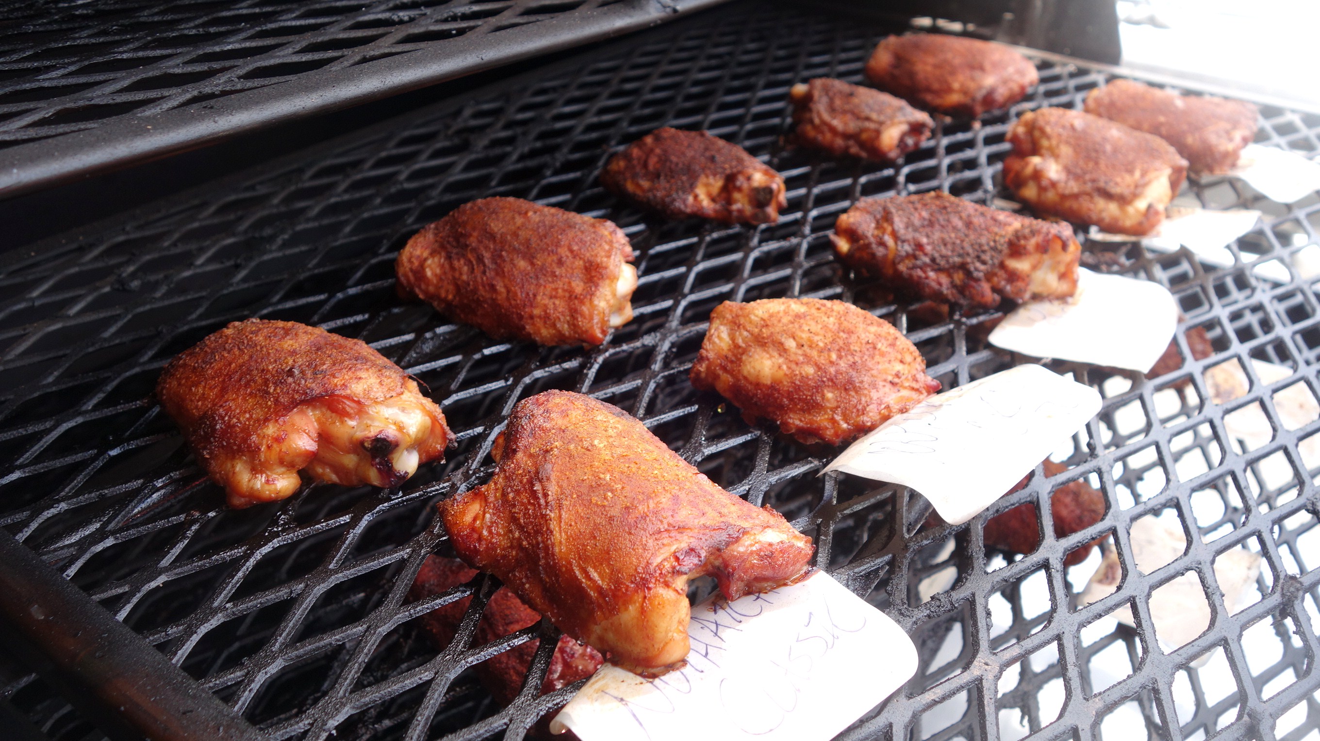 thighs, pork, and beef were smoking on the grill and ready for our tasting scores. An