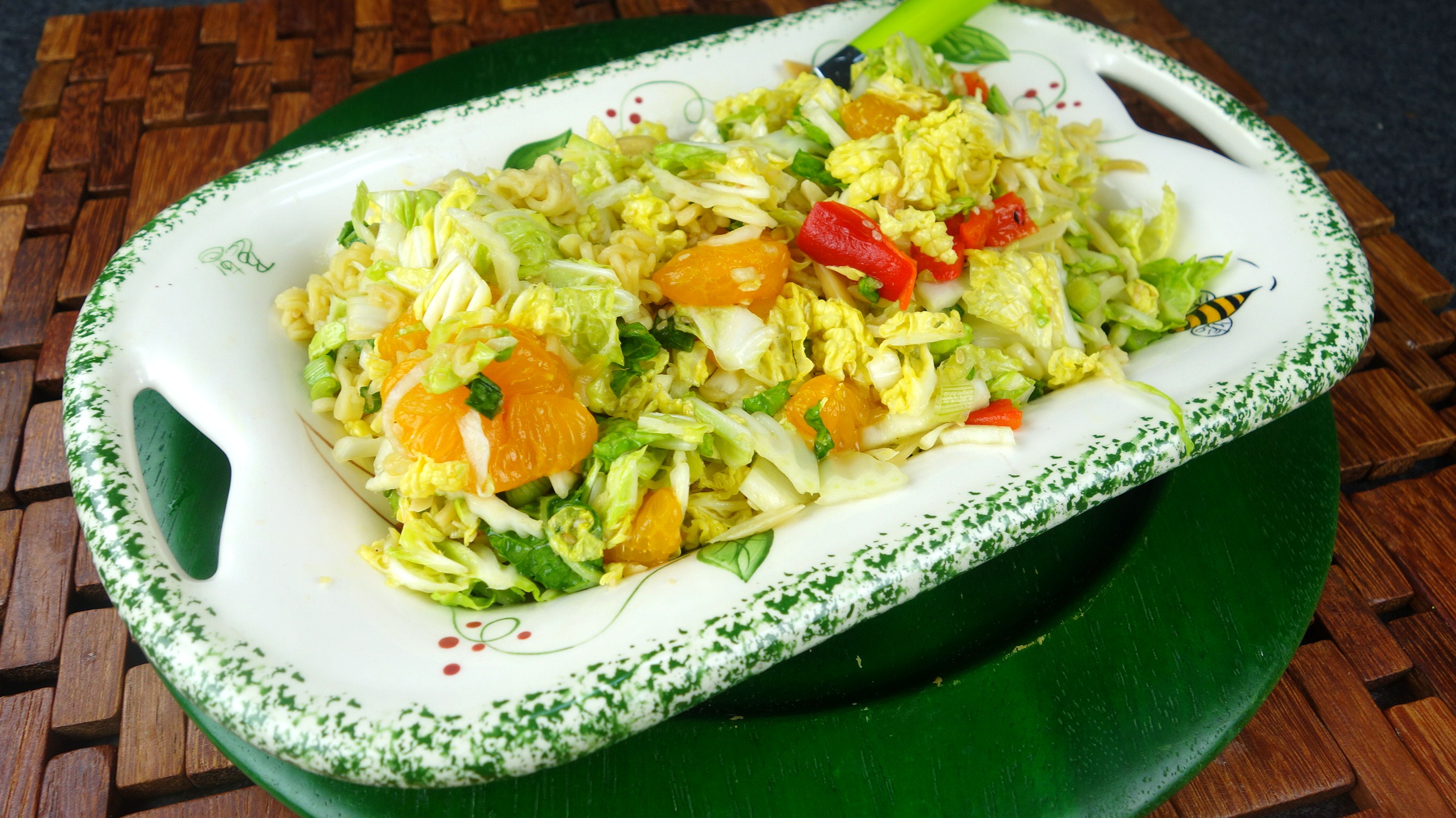 About the Recipe: This is a recipe that everyone loves. The Napa cabbage stays crispy in tangy vinegar and oil dressing, and almonds, sesame seeds and bits of pasta add a surprise crunch. If you marinate the salad, the noodles will soften slightly. For added flavor, add those juicy oranges and colorful peppers. Serve it with your favorite summer supper.